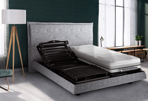 Le lit de relaxation André Renault propose un sommier électrique à plusieurs plans doté de lattes larges ou palpeurs, pour épouser les courbes du corps et aligner tête, cervicales et lombaires.